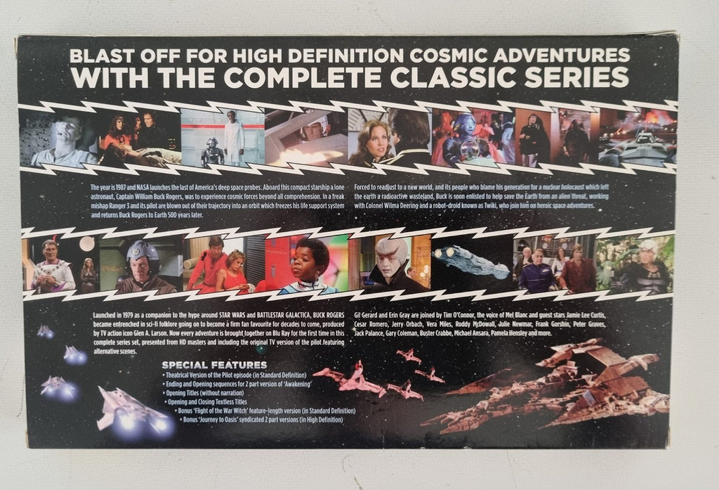 Capt. William "Buck" Rogers is a jovial space cowboy who is accidentally time-warped from 1987 to 2491. Earth is engaged in interplanetary war following a global holocaust, and Buck's piloting skills make him an ideal starfighter recruit for the Earth Defense Directorate, where his closest colleagues are Dr. Huer (Tim O'Connor), squadron leader Col. Wilma Deering (former model Erin Gray), the wisecracking robot Twiki (voiced by cartoon legend Mel Blanc), and a portable computer-brain named Dr. Theopolis.
