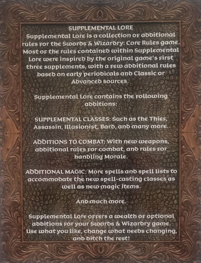 This book provides supplemental rules for characters, classes, abilities, and combat in Swords & Wizardry. It includes additional benefits for demi-human races, exceptional strength rules for fighters, and more detailed abilities for thief, assassin, paladin, monk, and druid classes. Combat rules cover weapon and armor types, damage against larger opponents, and spell lists and descriptions for druids.