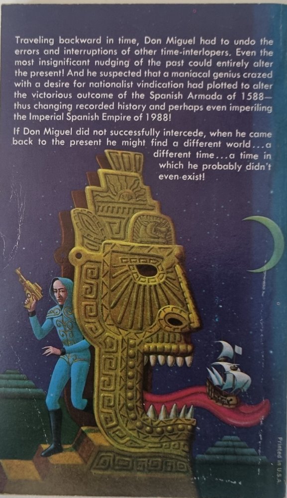 Traveling backward in time, Don Miguel had to undo the errors and interruptions of other time-interlopers. Even the most insignificant nudging of the past could entirely alter the present! And he suspected that a maniacal genius crazed with a desire for nationalist vindication had plotted to alter the victorious outcome of the Spanish Armada of 1588 - thus changing recorded history and perhaps even imperiling the Imperial Spanish Empire of 1988!If Don Miguel did not successfully intercede, when he came back to the present he might find a different world...a different time...a time in which he probably didn't even exist!